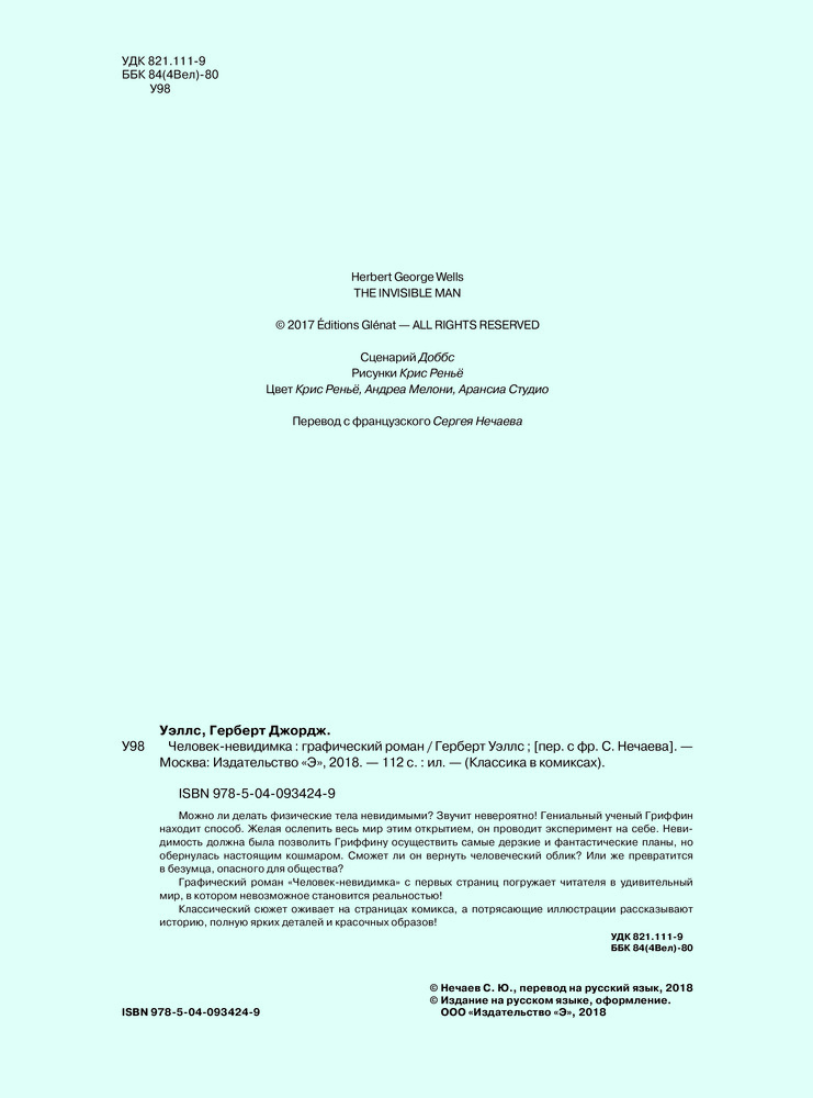 Человек-невидимкаВ данный момент этот товар отсутствует в продаже. Возможно, у нас найдется аналогичный или похожий товар здесь. Серия: Классика в комиксах Можно ли делать физические тела невидимыми? Звучит невероятно! Гениальный ученый Гриффин находит способ. Желая ослепить весь мир этим открытием, он проводит эксперимент на себе. Невидимость должна была позволить Гриффину осуществить самые дерзкие и фантастические планы, но обернулась настоящим кошмаром. Сможет ли он вернуть человеческий облик? Или же превратится в безумца, опасного для общества? Графический роман «Человек-невидимка» с первых страниц погружает читателя в удивительный мир, в котором невозможное становится реальностью! Классический сюжет оживает на страницах комикса, а потрясающие иллюстрации рассказывают историю, полную ярких деталей и красочных образов! |