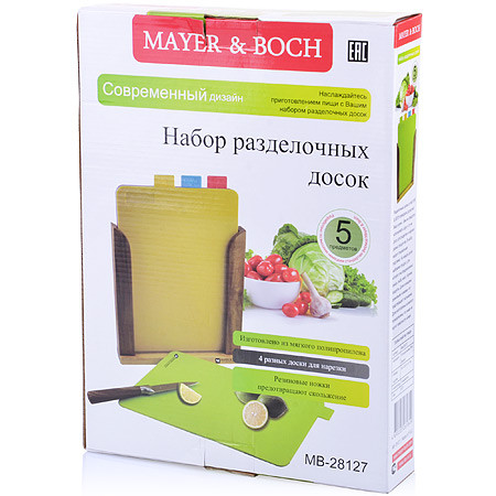 Mayer & Boch Набор разделочных досок (5 предметов)В данный момент этот товар отсутствует в продаже. Возможно, у нас найдется аналогичный или похожий товар здесь. Разделочные доски прекрасно дополнят Вашу кухню. Вам не придется использовать одну и ту же доску для разделки и нарезки разных продуктов. В набор входит специальная подставка. На каждой доске изображен продукт, для которого она предназначена. Доски изготовлены из мягкого полипропилена, что никак не портит поверхность ножей. |