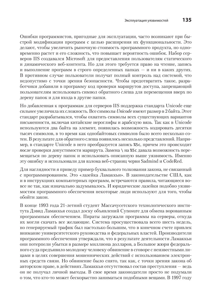 Серия: Библиотека программиста Каждый программист по сути своей — хакер. Ведь первоначально хакингом называли поиск искусного и неочевидного решения. Понимание принципов программирования помогает находить уязвимости, а навыки обнаружения уязвимостей помогают создавать программы, поэтому многие хакеры занимаются тем и другим одновременно. Интересные нестандартные ходы есть как в техниках написания элегантных программ, так и в техниках поиска слабых мест. С чего начать? Чтобы перезаписывать память с помощью переполнения буфера, получать доступ к удаленному серверу и перехватывать соединения вам предстоит программировать на Си и ассемблере, использовать шелл-код и регистры процессора, познакомиться с сетевыми взаимодействиями и шифрованием и многое другое. |