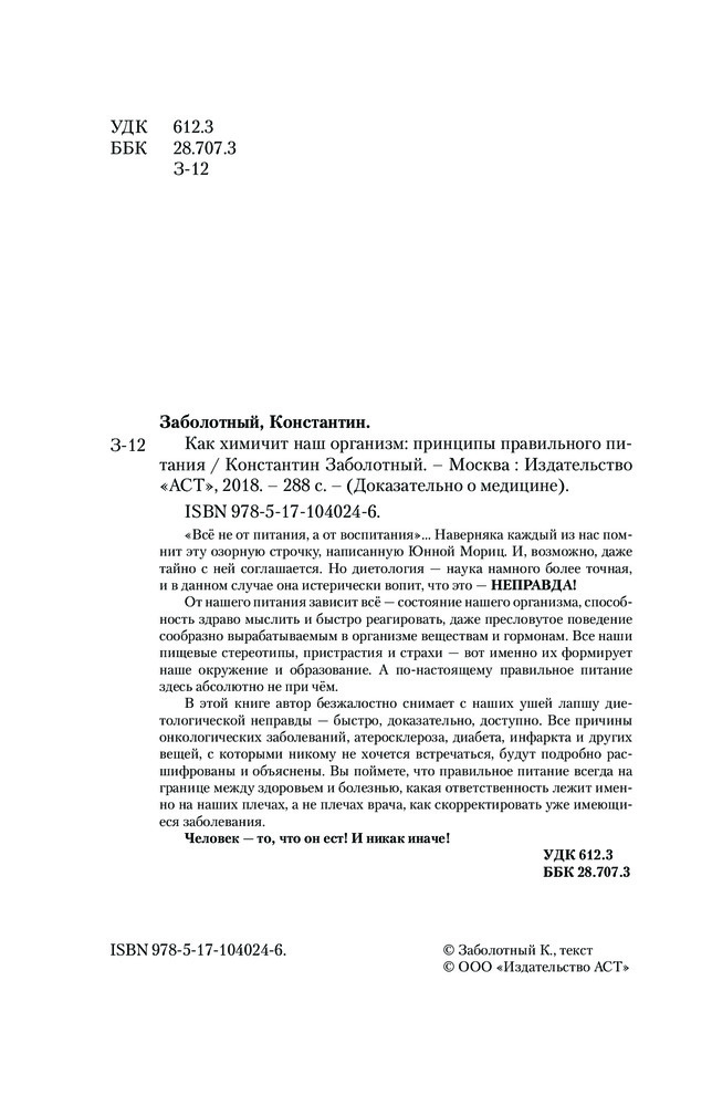 Как химичит наш организм. Принципы правильного питанияКонстантин Борисович Заболотный В данный момент этот товар отсутствует в продаже. Возможно, у нас найдется аналогичный или похожий товар здесь. Серия: Доказательно о медицине «Всё не от питания, а от воспитания»... Наверняка каждый из нас помнит эту озорную строчку, написанную Юнной Мориц. И, возможно, даже тайно с ней соглашается. Но диетология — наука намного более точная, и в данном случае она истерически вопит, что это — НЕПРАВДА! |