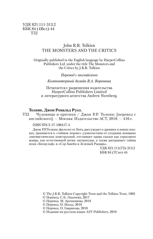 Чудовища и критикиВ данный момент этот товар отсутствует в продаже. Возможно, у нас найдется аналогичный или похожий товар здесь. Джон Р.Р. Толкин, филолог от Бога, рассуждает о древних и новых языках, признается в «тайном пороке» удовольствия от создания изящных лингвистических конструкций, отстаивает права сказки как серьезного жанра, как естественной ветви литературы, а также раскрывает тайны поэм «Беовульф» и «Сэр Гавейн и Зеленый Рыцарь». |