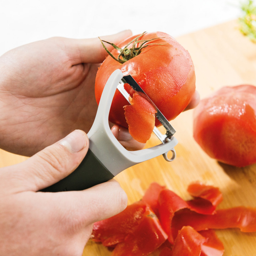 Нож из серии Leo предназначен для тонкой очистки помидоров и других мягких овощей и фруктов. Специальные зубчики помогают тонко снять кожицу, не повредив нежную мякоть. Нож изготовлен из высококачественной нержавеющей стали марки X30Cr13, ручка — из прочного полипропилена с покрытием soft grip. Нож рекомендуется мыть вручную.