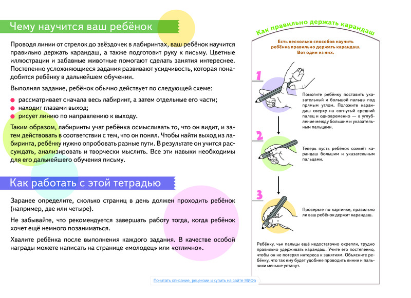 Очень интересные лабиринты. Первый раз пробовали рисовать и находить выход, все достаточно понятно и доступно для малыша. Сразу ощущается, как у ребенка начинает работать мышление в процессе и легкая усталость. Первый знак - пора остановится. А также ребенку нравилось выполнять задания, для меня это важный момент.
