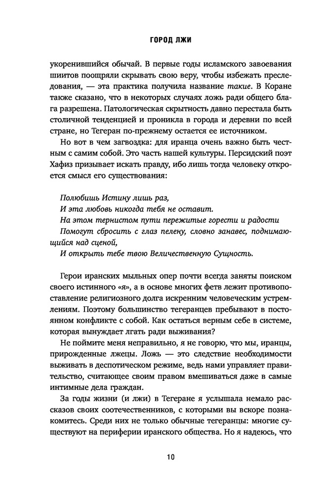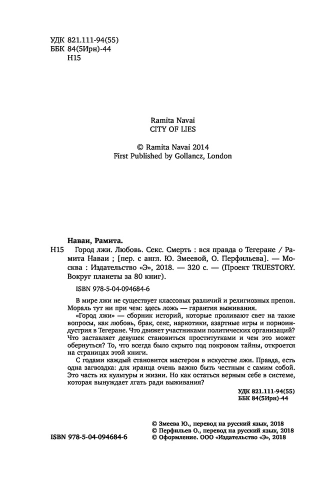 Город лжи. Что скрывают улицы ТегеранаВ данный момент этот товар отсутствует в продаже. Возможно, у нас найдется аналогичный или похожий товар здесь. Серия: Проект TRUESTORY. Вокруг планеты за 80 книг В мире лжи не существует классовых различий и религиозных препон. Мораль тут ни при чем: здесь ложь — гарантия выживания.«Город лжи» — сборник историй, которые проливают свет на такие вопросы, как любовь, брак, секс, наркотики, азартные игры и порноиндустрия в Тегеране. Что движет участниками политических организаций? Что заставляет девушек становиться проститутками и чем это может обернуться? То, что всегда было скрыто под покровом тайны, откроется на страницах этой книги.С годами каждый становится мастером в искусстве лжи. Правда, есть одна загвоздка: для иранца очень важно быть честным с самим собой. Это часть их культуры и жизни. Но как остаться верным себе в системе, которая вынуждает лгать ради выживания? |