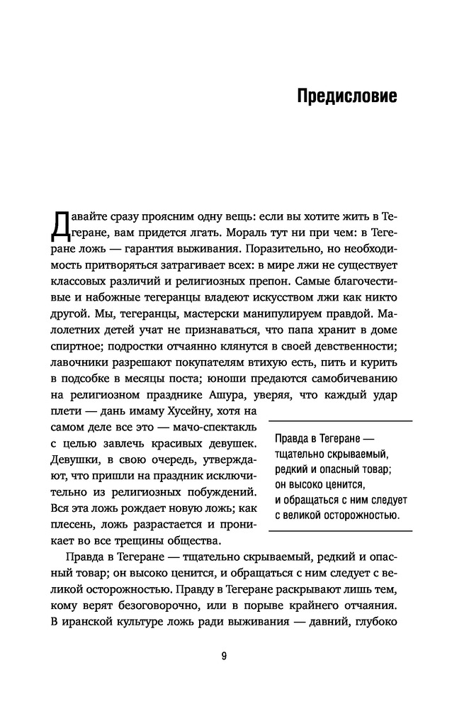 Книга отличного качества, очень красивая обложка, постарались даже над форзацем и нахзацем. Сама книга очень интересная. Конечно, мы все понимаем, что не существует идеальной мусульманской страны, что люди так или иначе исковеркают религиозные заповеди, но узнать все секреты изнутри было действительно интересно. Здесь повествуются истории 8 людей, и все они показывают иранцев в новом свете. Я и не думала, что безнравственность такого уровня может сосуществовать с исламом, в стране, где пять раз за день громко звучит азан. Советую к прочтению, сложно оторваться от сюжета. Написано простым языком, есть термины, которые там же и поясняются.