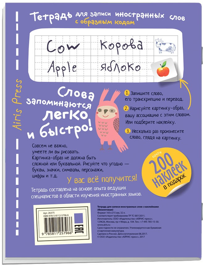 Тетрадь для записи иностранных слов (с наклейками)В данный момент этот товар отсутствует в продаже. Возможно, у нас найдется аналогичный или похожий товар здесь. Серия: Тетради для записи иностранных слов Эта тетрадь поможет детям быстрее выучить новые иностранные слова. Благодаря уникальной методике информация надёжно фиксируется в памяти, а у ребёнка возрастает интерес к учёбе. |