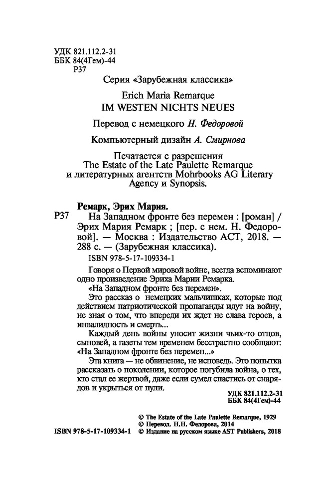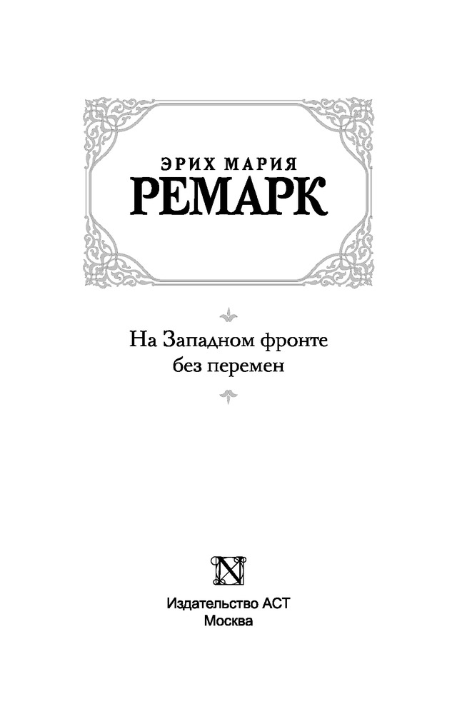 На Западном фронте без переменВ данный момент этот товар отсутствует в продаже. Возможно, у нас найдется аналогичный или похожий товар здесь. Серия: Зарубежная классика Говоря о Первой мировой войне, всегда вспоминают одно произведение Эриха Марии Ремарка. |