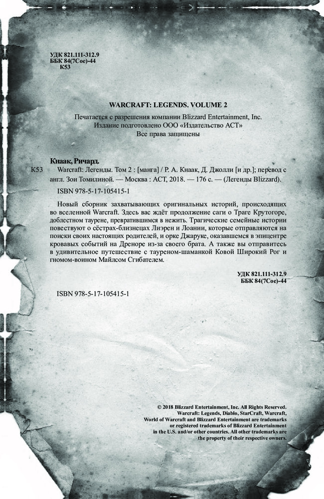 Warcraft. Легенды. Том 2В данный момент этот товар отсутствует в продаже. Возможно, у нас найдется аналогичный или похожий товар здесь. Серия: Легенды Blizzard Новый сборник захватывающих оригинальных историй, происходящих во вселенной Warcraft. Здесь вас ждёт продолжение саги о Траге Крутогоре, доблестном таурене, превратившимся в нежить. Трагические семейные истории повествуют о сёстрах-близнецах Лиэрен и Лоании, которые отправляются на поиски своих настоящих родителей, и орке Джаруке, оказавшемся в эпицентре кровавых событий на Дреноре из-за своего брата. А также вы отправитесь в удивительное путешествие с тауреном-шаманкой Ковой Широкий Рог и гномом-воином Майлсом Сгибателем. |