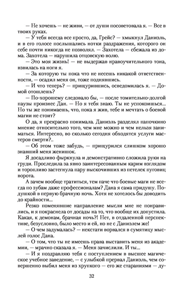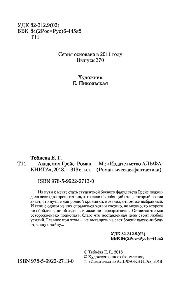 Академия ГрейсВ данный момент этот товар отсутствует в продаже. Возможно, у нас найдется аналогичный или похожий товар здесь. Серия: Романтическая фантастика На пути к мечте стать студенткой боевого факультета Грейс поджидало всего два препятствия, зато каких! Любящий отец, который всегда знает, что лучше для родной кровинки, и жених, отцом же выбранный. И если с одним из них справиться хоть и сложно, но можно, то второго не обойдешь, не объедешь и даже не перепрыгнешь. Остается только осторожненько подкопать, благо что поставленная цель стоит любых усилий. Главное при этом — не вытащить на свет божий какую-нибудь страшную тайну... |