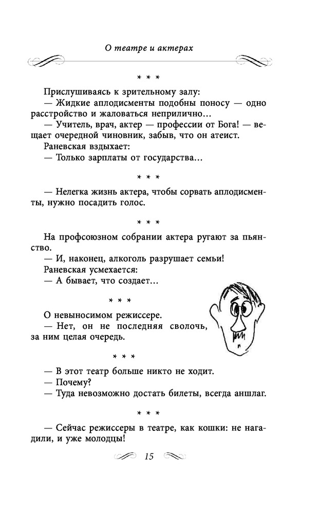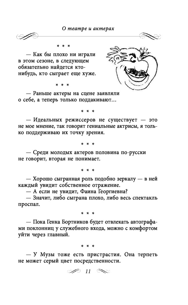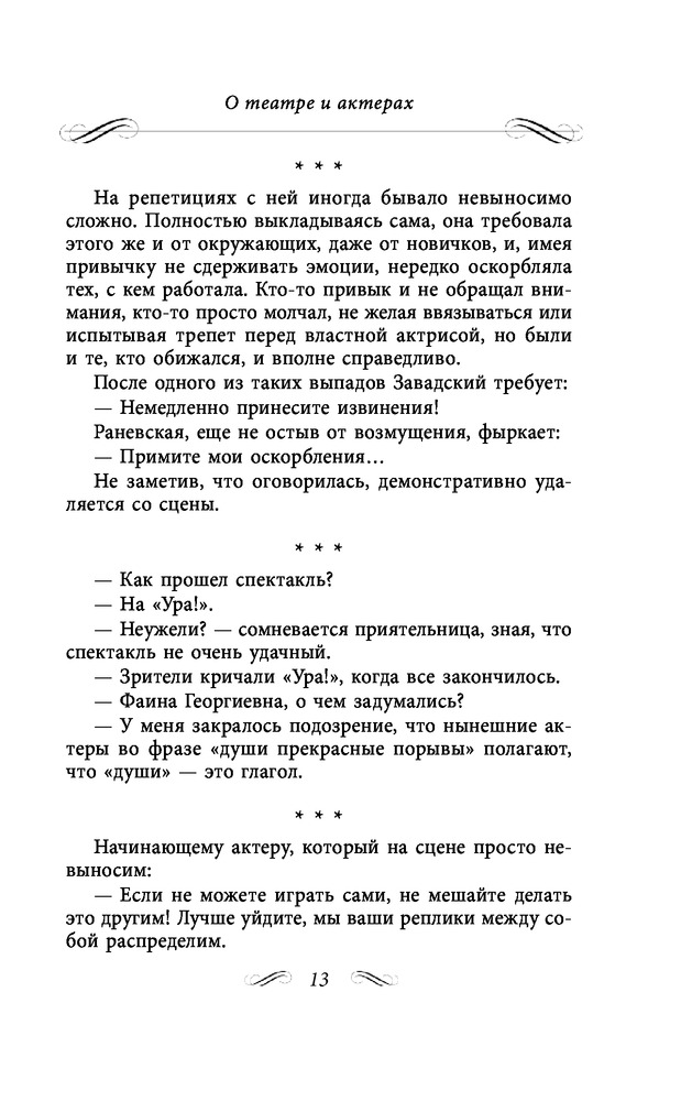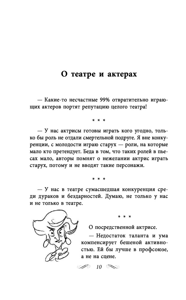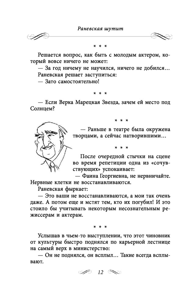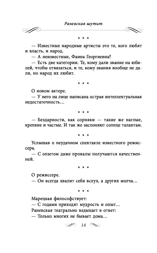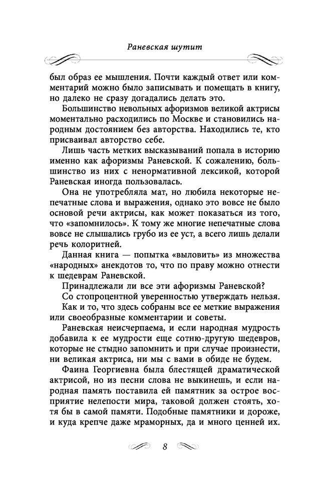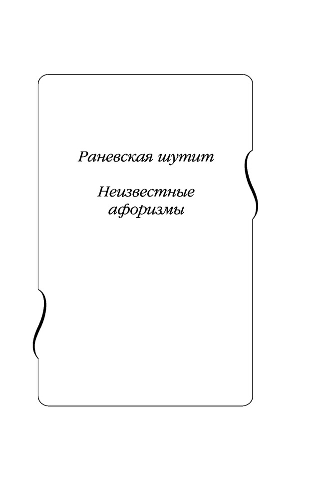Состоит из трех глав. 1)Неизвестные афоризмы. 2)Мудрые остроты. 3)Муля, не нервируй меня. Содержание книги включает 413 страниц текста. Читается легко, очень смешно. Это же Раневская!!!