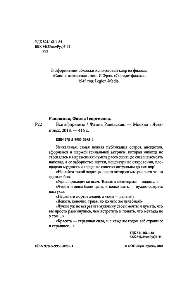 💳 Оплатить за товар можно при получении 🇰🇿 Есть бесплатная доставка по Казахстану 🎁 Копите бонусы с каждой покупки Серия: Афоризмы великих женщин Уникальная, самая полная публикация острот, анекдотов, афоризмов и шаржей гениальной актрисы, которая никогда не стеснялась в выражениях и умела рассмешить до слез и высмеять наповал, а ее забористые шутки, нецензурные откровения, площадная мудрость и «вредные советы» актуальны до сих пор! «Не найти такой задницы, через которую мы уже чего-то ни сделали бы» «Удача приходит ко всем. Только к некоторым — задом...» «Чтобы и овцы были целы, и волки сыты — нужно сожрать пастуха» «Не деньги портят людей, а люди — деньги!» «Деньги, конечно, грязь, но до чего же лечебная!» «Лучше уж не встретить мужчину своей мечты и думать, что вы просто разминулись, чем встретить и понять, что мечтала не о том...» «Красота — страшная сила, и с каждым годом всё страшнее и страшнее...» |