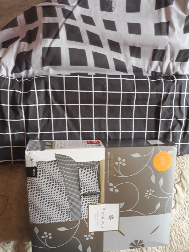 Комплект отличный, правда в реальности темнее, чем выглядит на фото, комбинация серого и темно-серого. Бязь сама по себе с редким плетением, ткань "светится" - это неплохо, просто нужно быть к этому готовым. А так, все качественно пошито, никаких нареканий.