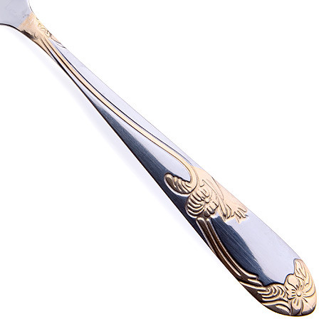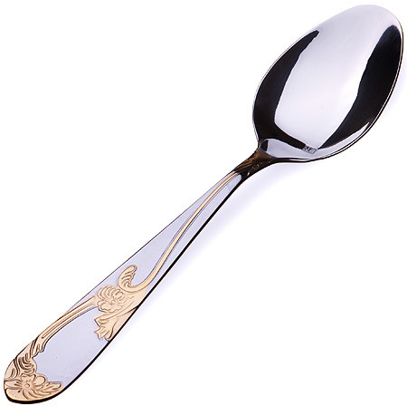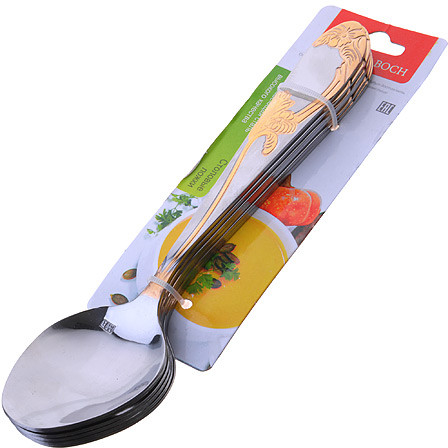 Набор из 6-тих ложек выполнен из высококачественной нержавеющей стали, которая проходит тщательный технический контроль. Качественная полировка обеспечивает высокую степень гигиеничности приборов. Приборы из нержавеющей стали отличаются высокими антикоррозионными свойствами и значительной устойчивостью к воздействию кислот и щелочей. Такая сталь не изменяет вкус и цвет пищи, не выделяет вредных веществ. Ручки ложек украшены элегантным золотым узором, выполненным по технологии плазменного напыления и обеспечивающим высокую износостойкость покрытия. Толщина металла составляет 2,2 мм.