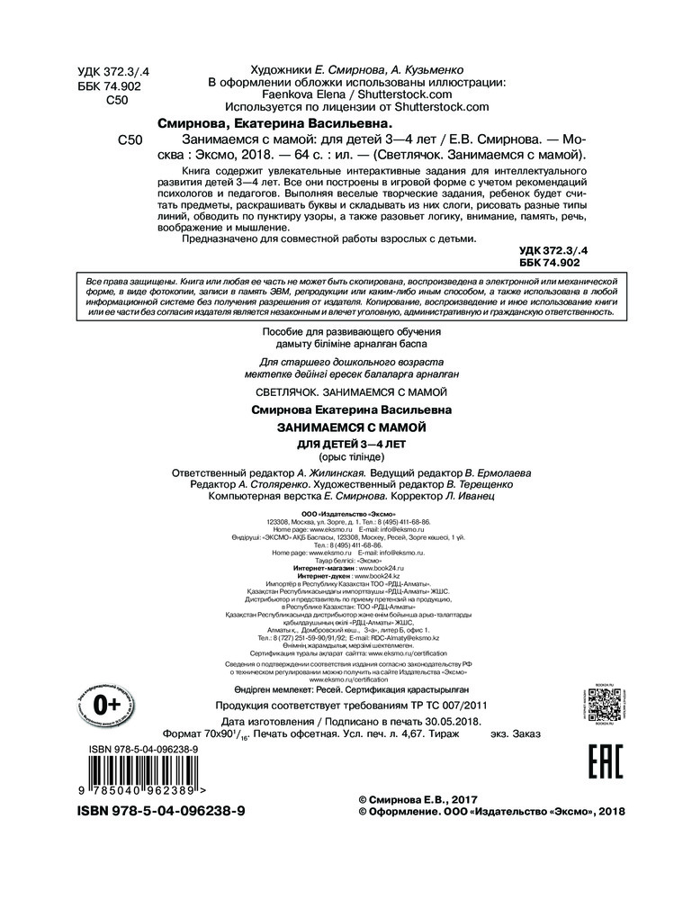 💳 Оплатить за товар можно при получении 🇰🇿 Есть бесплатная доставка по Казахстану 🎁 Копите бонусы с каждой покупки Серия: Светлячок. Занимаемся с мамой (обложка) Интересное, яркое, красочное пособие с занимательными заданиями, направленно на умственное и творческое развитие малыша. Увлекательные задания, которые так нравятся детям, превратят занятия в веселую игру, во время которой ребенок научится считать, повторит буквы и сможет сложить из них слоги, потренируется рисовать разные типы линий и обводить по пунктиру предметы и узоры, разовьёт логику, внимание, память, речь, воображение и мышление. Разнообразные развивающие и обучающие задания сделают досуг малыша не только приятным, но и полезным. Очень удобно брать с собой в любую поездку — будет чем занять малыша с пользой для всех. |
