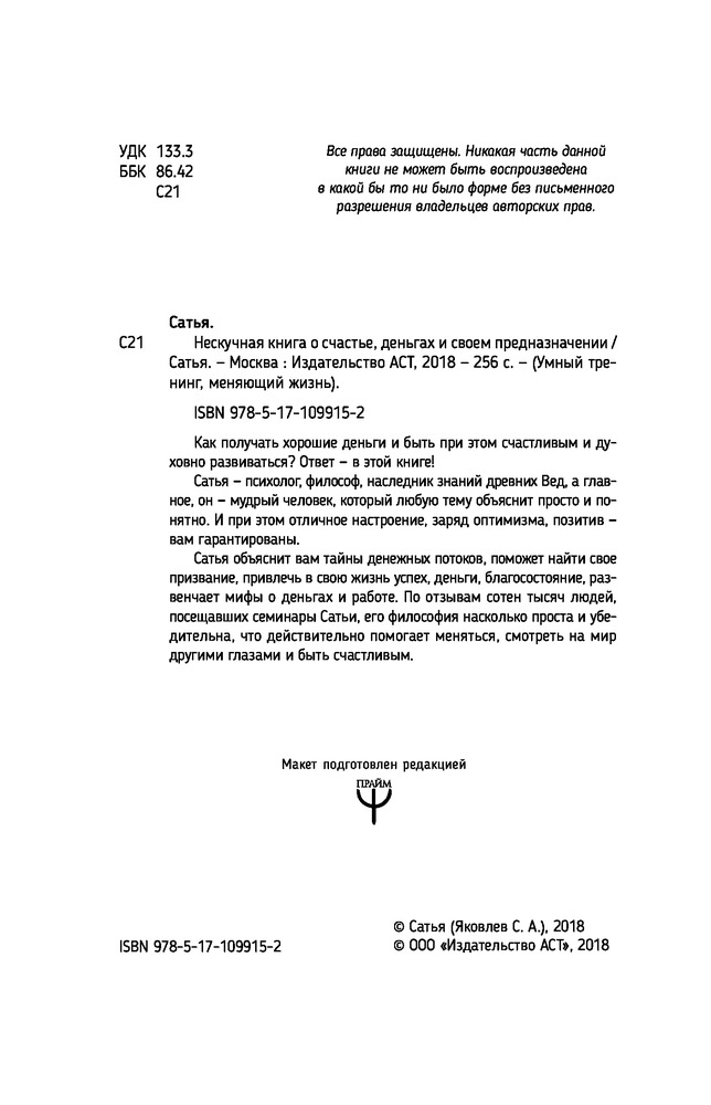 Сатья объяснит вам тайны денежных потоков, поможет найти свое призвание, привлечь в свою жизнь успех, деньги, благосостояние, развенчает мифы о деньгах и работе. По отзывам сотен тысяч людей, посещавших семинары Сатьи, его философия насколько проста и убедительна, что действительно помогает меняться, смотреть на мир другими глазами и быть счастливым. |