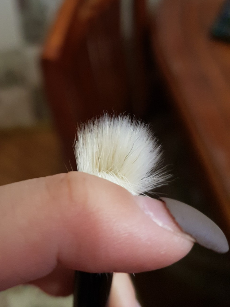 Кисть немного колется, но со своей задачей справляется. Несколько раз выпадали ворсинки и немного торчат в разные стороны. Камера не особо сфокусировала.Надеюсь по фото видно.
