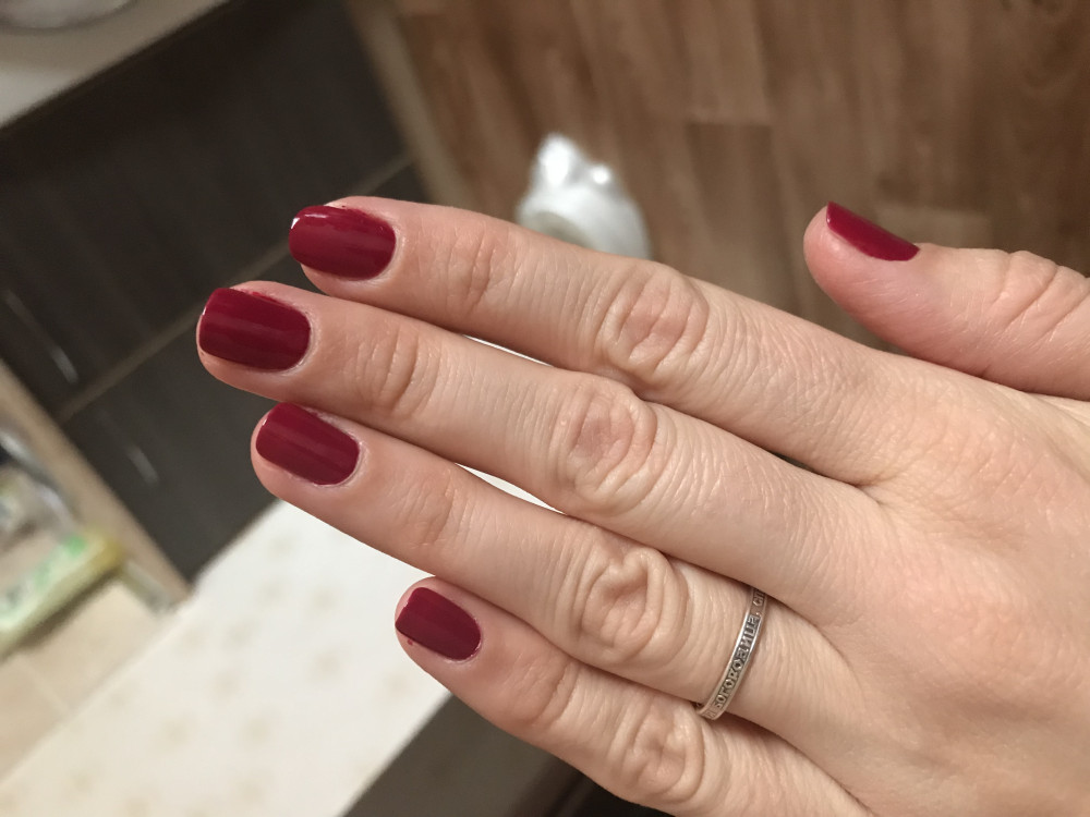 Заказывала тон классический красный. Очень красивый, плотный, достаточно одного покрытия. Продержался три дня, хотя домашние дела (мытьё посуды и тд) - только в перчатках.