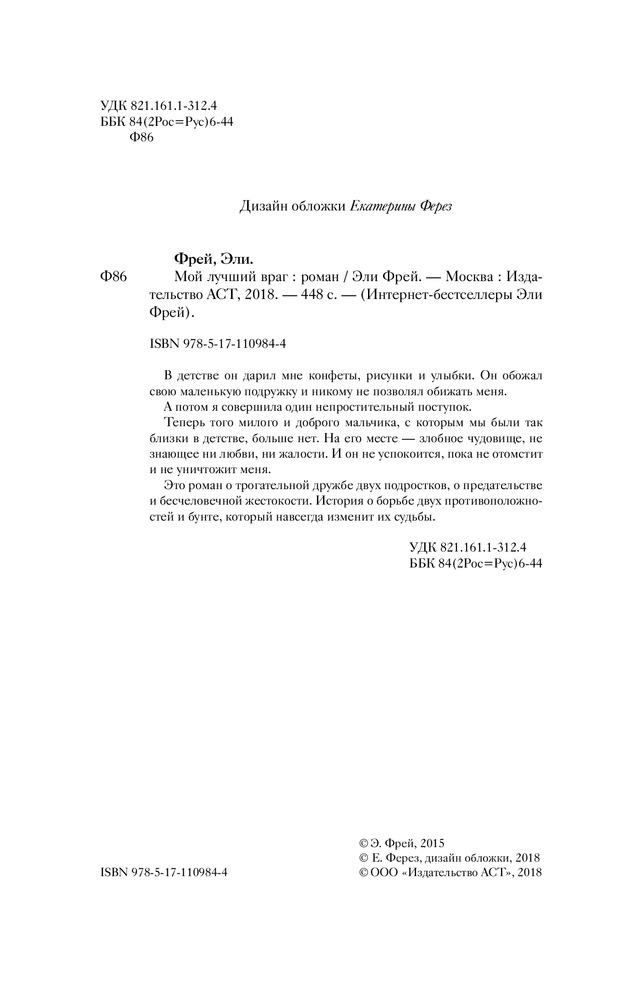 💳 Оплатить за товар можно при получении 🇰🇿 Есть бесплатная доставка по Казахстану 🎁 Копите бонусы с каждой покупки В детстве он дарил мне конфеты, рисунки и улыбки. Он обожал свою маленькую подружку и никому не позволял обижать меня. А потом я совершила один непростительный поступок. Теперь того милого и доброго мальчика, с которым мы были так близки в детстве, больше нет. На его месте — злобное чудовище, не знающее ни любви, ни жалости. И он не успокоится, пока не отомстит и не уничтожит меня. |