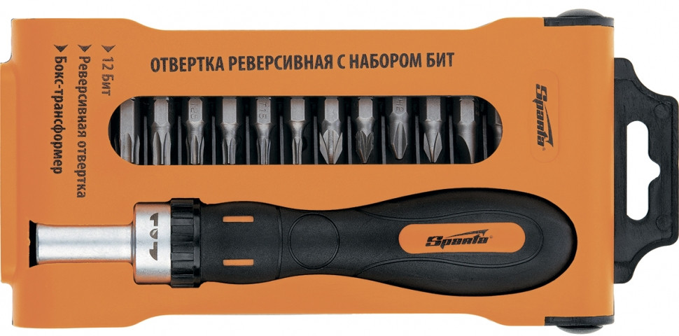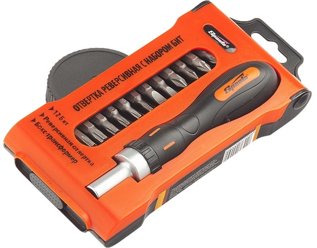 Отвертка реверсивная с двухкомпонентной эргономичной рукояткой. Реверсивный механизм дает возможность работать не перехватывая рукоятку, что обеспечивает более высокий крутящий момент и позволяет максимально снизить физическое напряжение. Биты (25 мм) изготовлены из хромованадиевой стали.