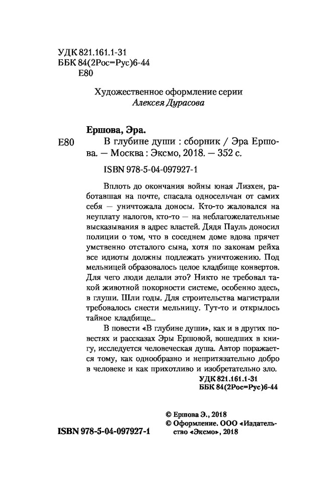 В глубине душиВ данный момент этот товар отсутствует в продаже. Возможно, у нас найдется аналогичный или похожий товар здесь. Серия: В глубине души. Проза Эры Ершовой (обложка) Вплоть до окончания войны юная Лизхен, работавшая на почте, спасала односельчан от самих себя — уничтожала доносы. Кто-то жаловался на неуплату налогов, кто-то — на неблагожелательные высказывания в адрес властей. Дядя Пауль доносил полиции о том, что в соседнем доме вдова прячет умственно отсталого сына, хотя по законам рейха все идиоты должны подлежать уничтожению. Под мельницей образовалось целое кладбище конвертов. Для чего люди делали это? Никто не требовал такой животной покорности системе, особенно здесь, в глуши. Шли годы. Для строительства магистрали требовалось снести мельницу. Тут-то и открылось тайное кладбище... |