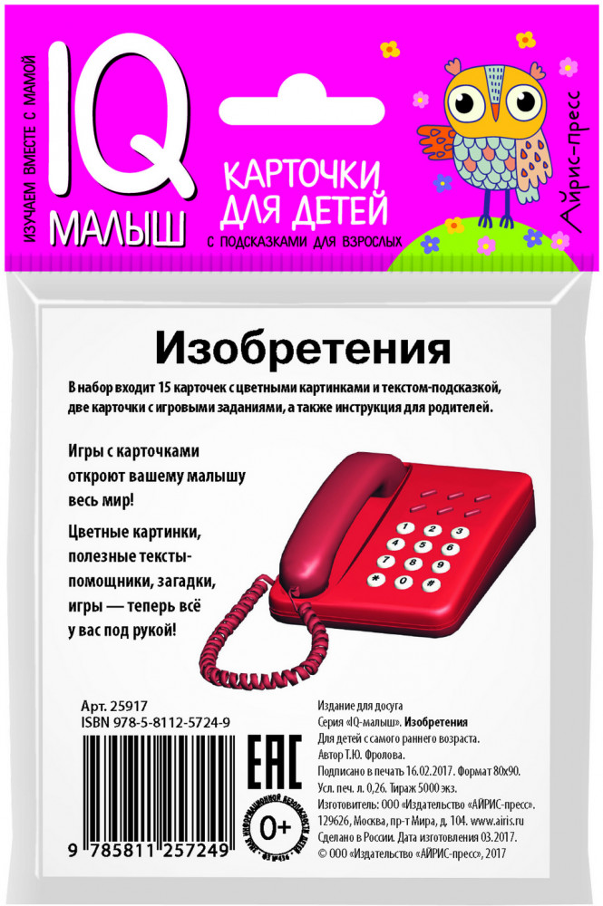 Серия: IQ малыш Набор двусторонних карточек «Изобретения» расскажет, кто, когда и как придумал хорошо знакомые ребёнку предметы. В набор входит 15 карточек с цветными картинками и текстом-подсказкой для чтения взрослыми детям на обороте, 2 карточки с игровыми заданиями и карточка с инструкцией для родителей. Для детей с самого раннего возраста. |