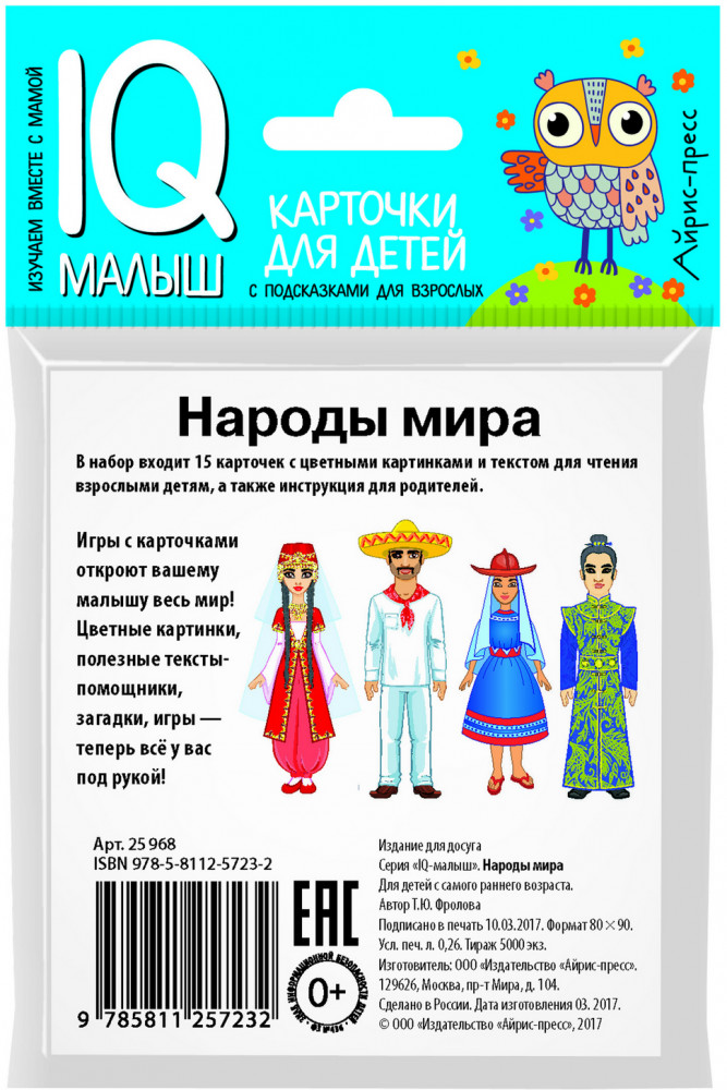 Серия: IQ малыш Игры с карточками не просто знакомят малыша с нашим удивительным миром, они развивают память, зрительное и слуховое восприятие, расширяют словарный запас, формируют интеллект. С помощью этого набора двусторонних карточек ребёнок познакомится с некоторыми самобытными народами, их традициями, обычаями и национальными особенностями. В комплект входит 15 карточек с цветными картинками и текстом-подсказкой на обороте для чтения взрослыми детям. |
