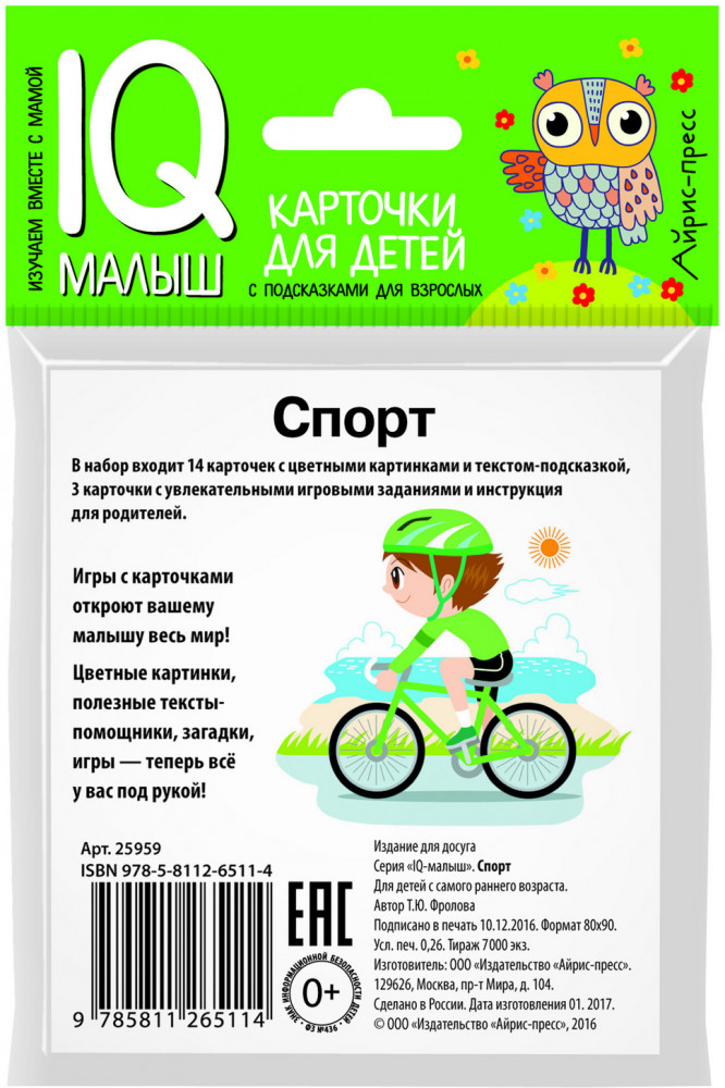 Серия: IQ малыш Набор двусторонних карточек «Спорт» знакомит ребёнка с олимпийскими видами спорта, историей их возникновения и правилами. В комплект входит 14 карточек с цветными картинками и текстом-подсказкой на обороте, 3 карточки с игровыми заданиями и карточка с инструкцией для родителей. Для детей с самого раннего возраста. |