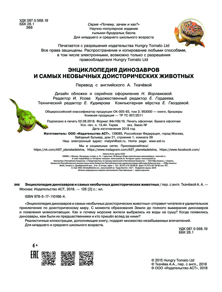Серия: Почему, зачем и как? «Энциклопедия динозавров и самых необычных доисторических животных» отправит читателя в удивительное приключение по доисторическому миру. С момента образования Земли до полного вымирания динозавров и появления млекопитающих. Как и почему морские жители выбрались из воды на сушу? Когда появились динозавры, кем были их предшественники и кто пришёл вслед за ними? |