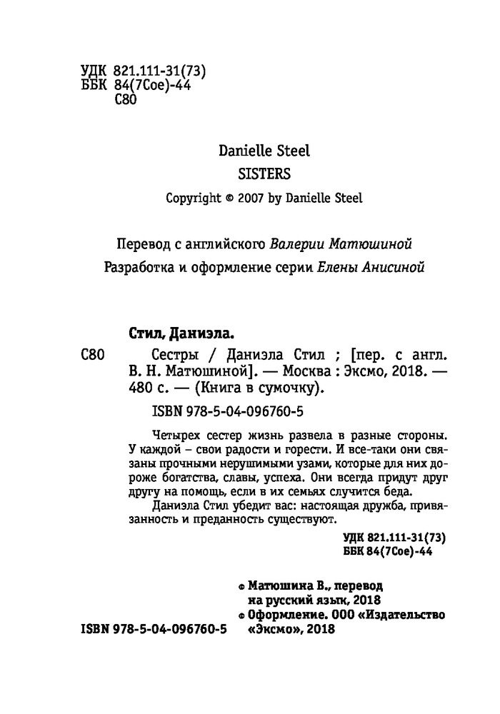 💳 Оплатить за товар можно при получении 🇰🇿 Есть бесплатная доставка по Казахстану 🎁 Копите бонусы с каждой покупки Серия: Книга в сумочку (обложка) Четырех сестер жизнь развела в разные стороны. У каждой — свои радости и горести. И все-таки они связаны прочными нерушимыми узами, которые для них дороже богатства, славы, успеха. Они всегда придут друг другу на помощь, если в их семьях случится беда. Даниэла Стил убедит вас: настоящая дружба, привязанность и преданность существуют. |