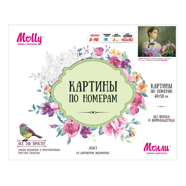 Molly Набор для раскрашивания по номерам на холсте «К. Разумов. Портрет девушки с пионами» (40×50 см)В данный момент этот товар отсутствует в продаже. Возможно, у нас найдется аналогичный или похожий товар здесь. Серия: Картины по номерам на холсте С помощью набора для творчества можно нарисовать картину по номерам Константина Разумова «Портрет девушки с пионами». На картине изображена молодая женщина в нежно-сиреневом платье. Рядом в вазе стоит букет роскошных, нежных пионов, которые удачно гармонируют с платьем. |