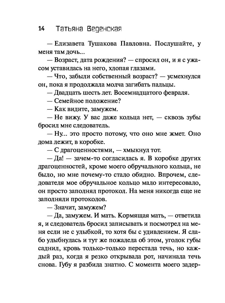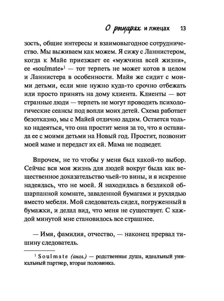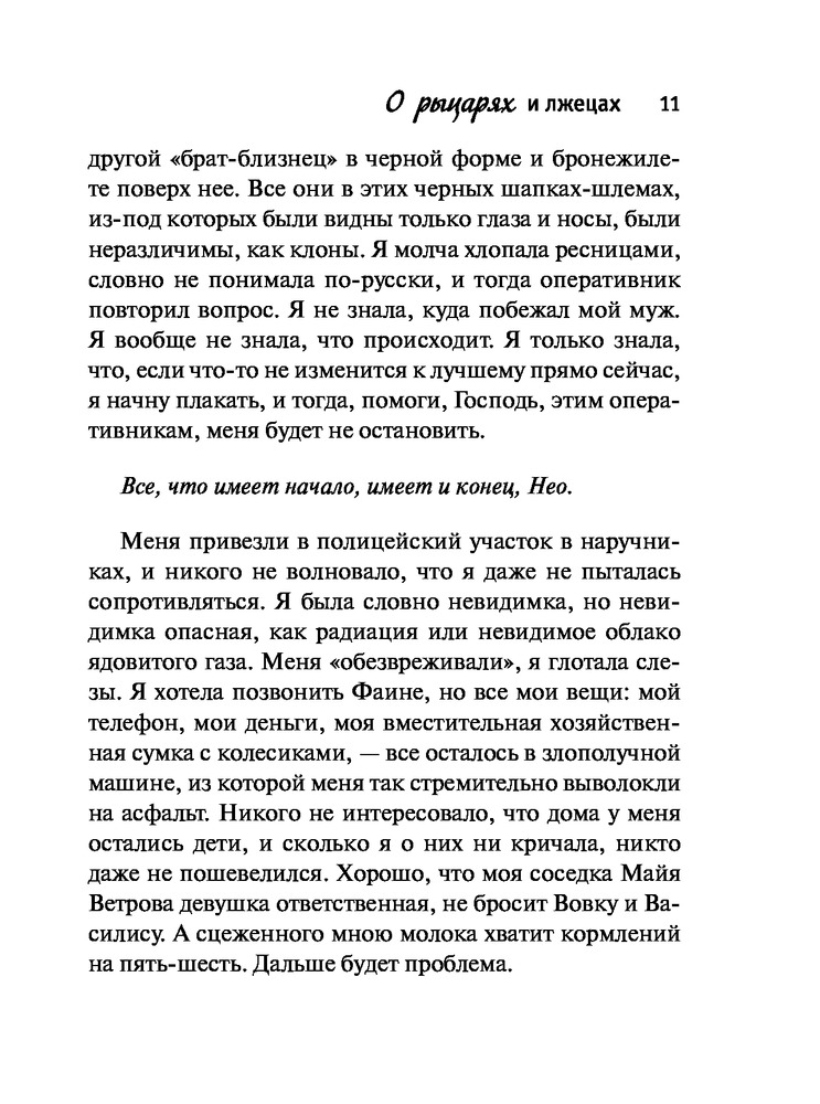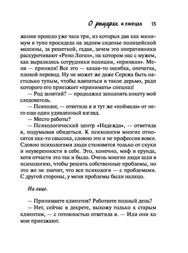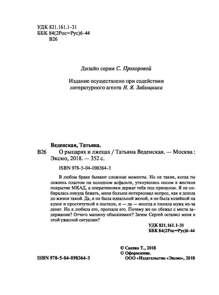 О рыцарях и лжецахВ данный момент этот товар отсутствует в продаже. Возможно, у нас найдется аналогичный или похожий товар здесь. Серия: Жизнь прекрасна. Позитивная проза Татьяны Веденской (обложка) В любом браке бывают сложные моменты. Но не такие, когда ты лежишь пластом на холодном асфальте, уткнувшись носом в жесткое покрытие МКАДА, а оперативники держат тебя под прицелом. Я не собиралась никуда бежать, меня больше интересовал вопрос, как я дошла до жизни такой. Да, я не была идеальной женой, я не была хозяйкой на кухне и проституткой в постели, и — да — иногда я пилила мужа из-за денег. Но я любила его, прощала его. Почему же он сбежал с места задержания? Отчего машину обыскивают? Зачем Сергей оставил меня в этой ужасной ситуации? |
