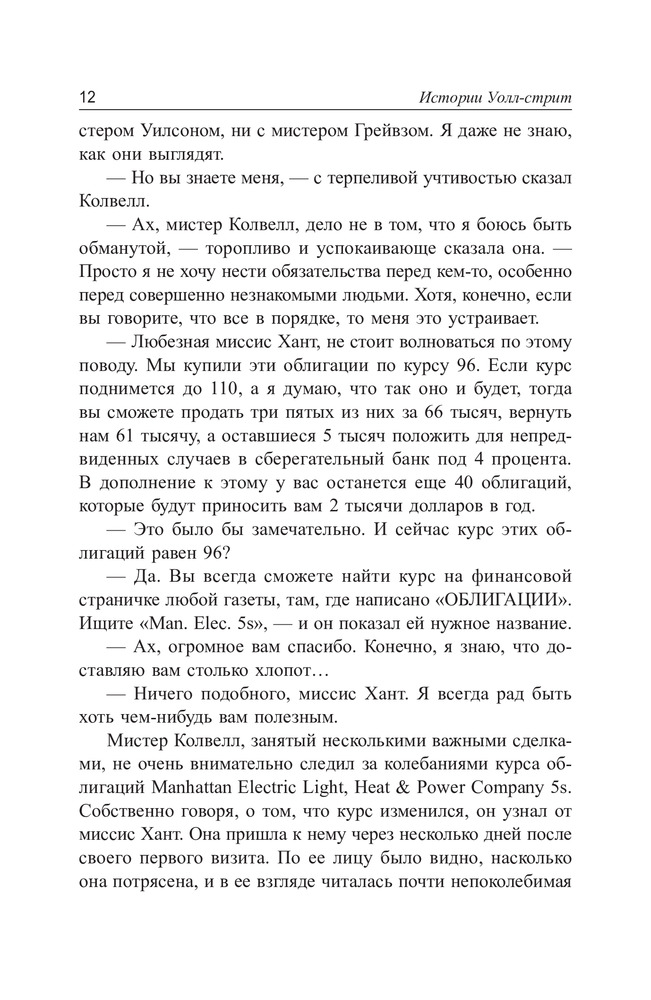 Серия: Бизнес Изданный в 1901 году сборник рассказов «Истории Уолл-стрит» — первая книга талантливого американского писателя Эдвина Лефевра, который прежде всего известен миру благодаря «Воспоминаниям биржевого спекулянта». Восемь историй ярко и максимально достоверно отображают жизнь, нравы, эмоции дельцов Нью-Йоркской фондовой биржи. Каждый рассказ из сборника — это сюжет, основанный на реальных событиях, к которым автор имел прямое отношение, поскольку чрезвычайно успешно совмещал работу журналиста и биржевого трейдера. И, что является, пожалуй, самым большим достоинством книг Эдвина Лефевра, более чем столетие они продолжают оставаться актуальными и увлекательными для всех, кто интересуется биржевыми стратегиями и операциями. |