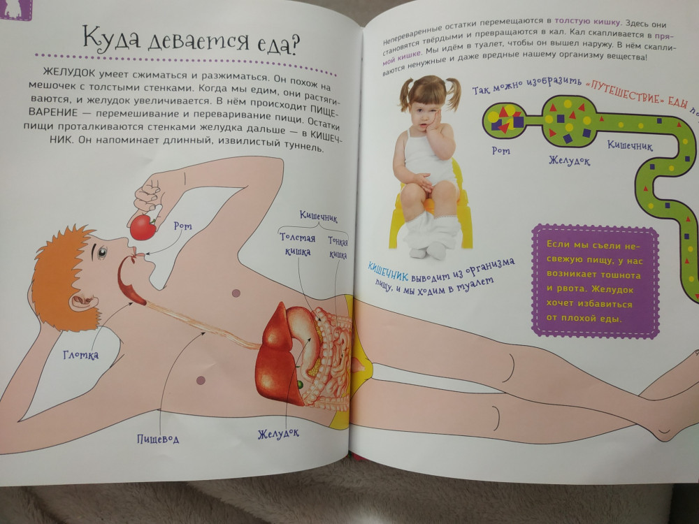 Содержание книги разочаровало, много ненужной информации, зачем столько людей там изображать(фото прилагается). Хотелось бы побольше информации о теле человека, картинки организма человека, иллюстрация внутренних органов изображена горизонтально, неудобно вертеть книгу ( Очень разочарована содержанием, а так книга глянцевая, единственный +
