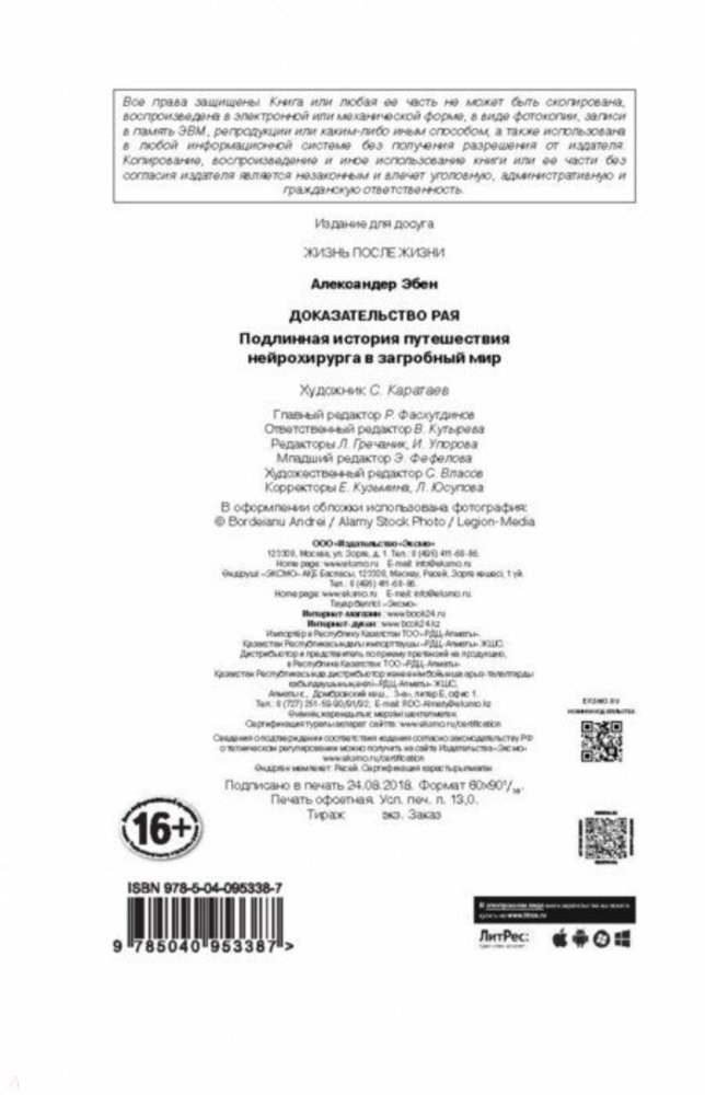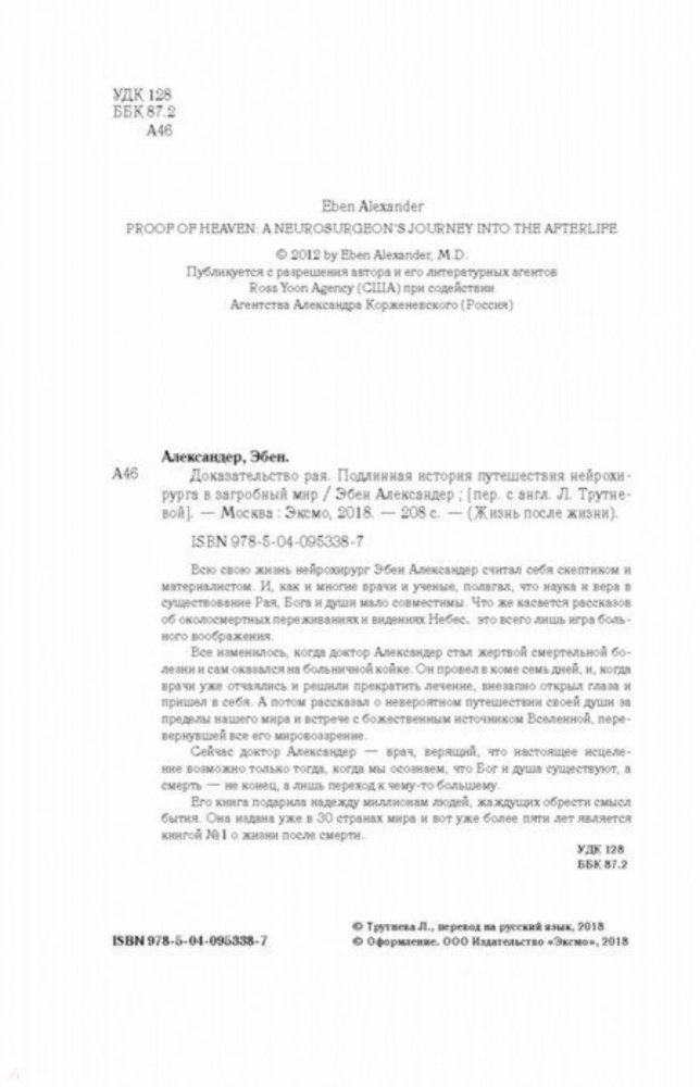 Доказательство рая. Подлинная история путешествия нейрохирурга в загробный мирВ данный момент этот товар отсутствует в продаже. Возможно, у нас найдется аналогичный или похожий товар здесь. Серия: Жизнь после жизни Всю свою жизнь нейрохирург Эбен Александер считал себя скептиком и материалистом. И, как и многие врачи и ученые, полагал, что наука и вера в существование Рая, Бога и души мало совместимы. Что же касается рассказов об околосмертных переживаниях и видениях Небес... это всего лишь игра больного воображения. Все изменилось, когда доктор Александер стал жертвой смертельной болезни и сам оказался на больничной койке. Он провел в коме семь дней, и когда врачи уже отчаялись и решили прекратить лечение, внезапно открыл глаза и пришел в себя. А потом рассказал о невероятном путешествии своей души за пределы нашего мира и встрече с божественным источником Вселенной, перевернувшей все его мировоззрение. |