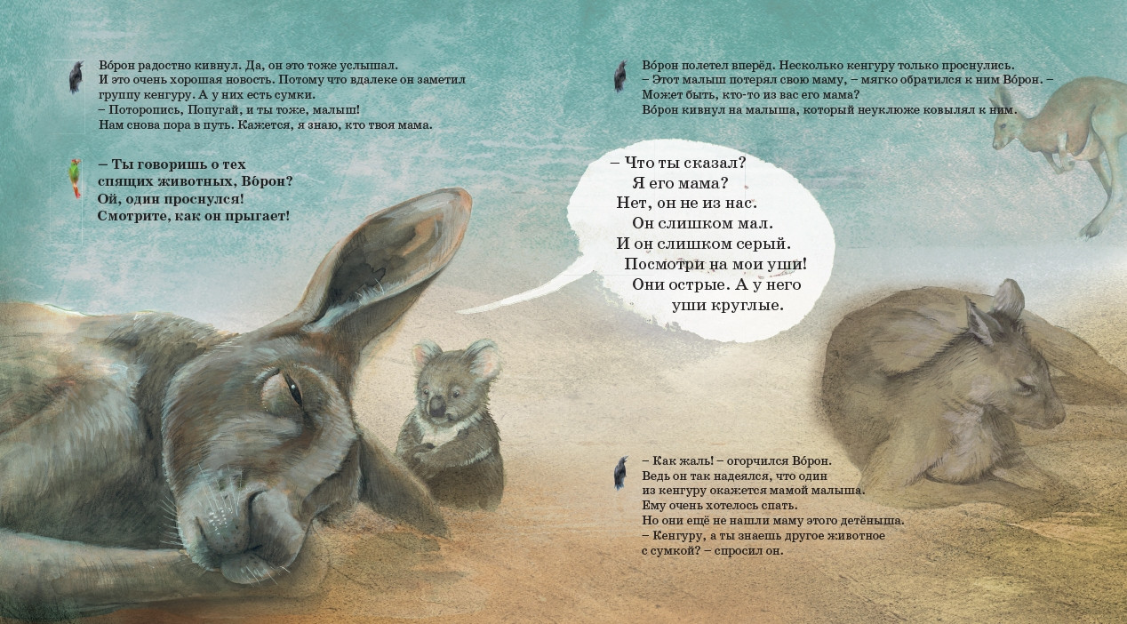 Необычная книга о загадочных животных Австралии, рассказанная Вороном и Попугаем. Читать ее перед сном самое то - есть определенный темп и настрой в книге, под конец часто повторяющиеся слова о том, что уже поздно и пора бы спать. Ребенок получает и полезную информацию и правильный настрой!