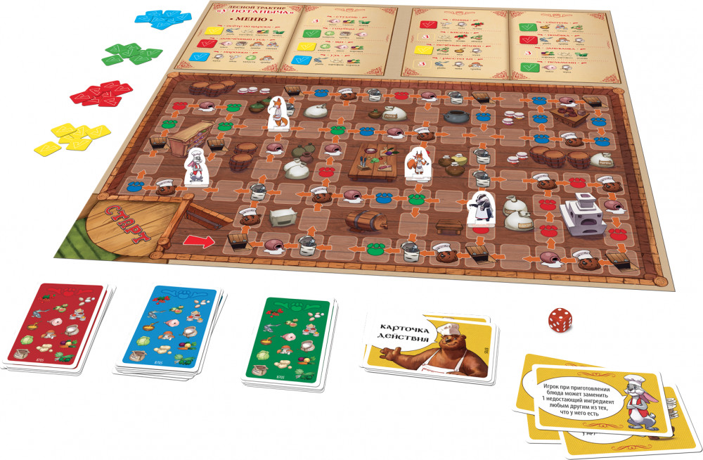 Разложите на столе игровое поле — кухню трактира. Перемещаясь по кухне, игроки будут находить нужные ингредиенты для приготовления блюд меню. Карты продуктов и действий разложите по цветам в соответствующие колоды и разместите рядом с полем.