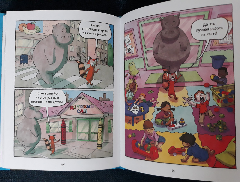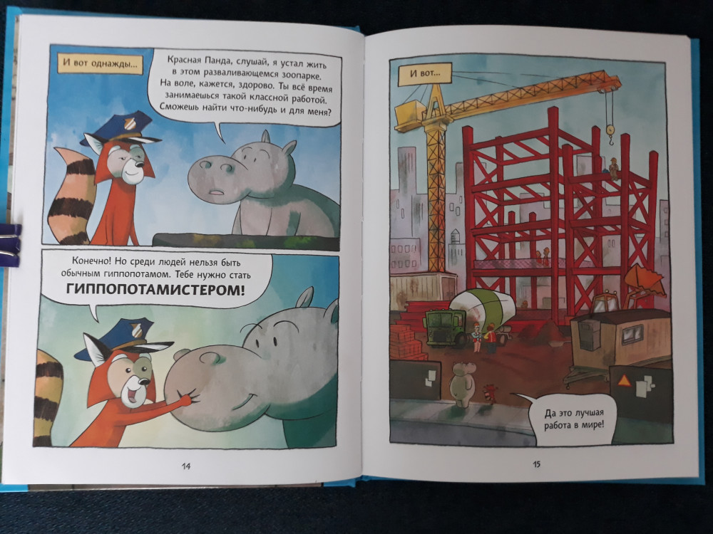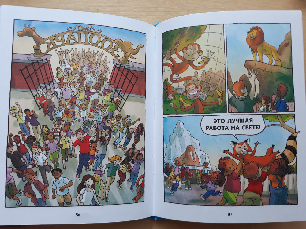 Книга-комикс. Прекрасно подойдет на роль книги, которую захочется читать после букваря. Ребенку очень понравилась, перечитывал несколько раз. Познавательная история о выборе любимой профессии. Очень яркая. Размер средний, качественный офсет.