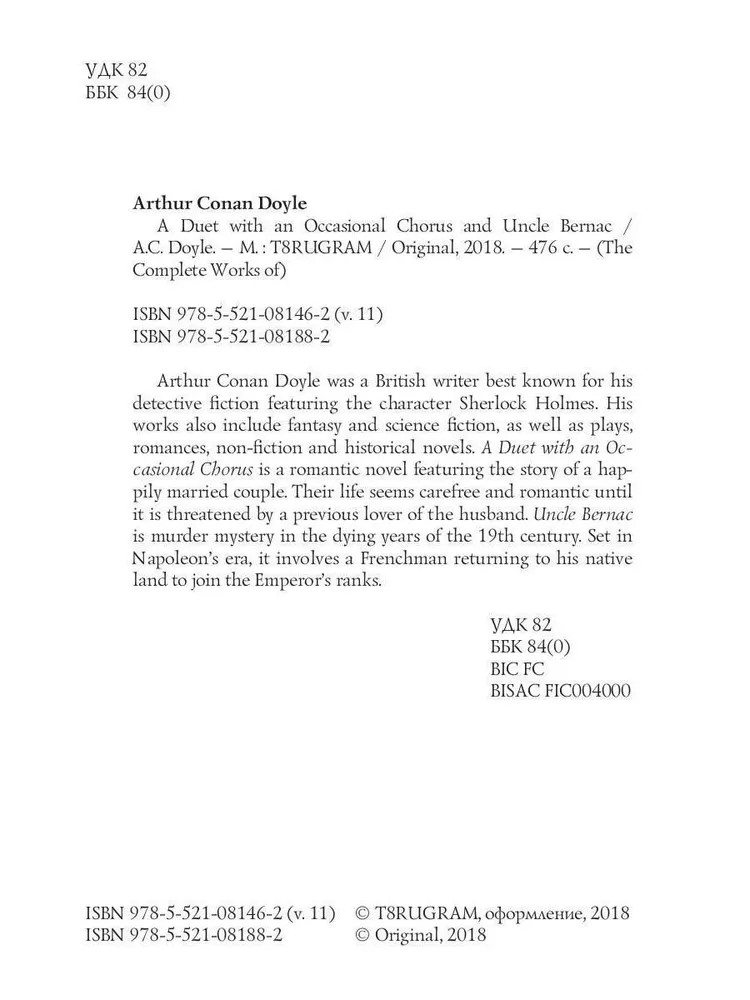 Серия: The Complete Works of Arthur Conan Doyle was a British writer best known for his detective fiction featuring the character Sherlock Holmes. His works also include fantasy and science fiction, as well as plays, romances, non-fiction and historical novels. A Duet with an Occasional Chorus is a romantic novel featuring the story of a happily married couple. Their life seems carefree and romantic until it is threatened by a previous lover of the husband. Uncle Bernac is murder mystery in the dying years of the 19th century. Set in Napoleon’s era, it involves a Frenchman returning to his native land to join the Emperor’s ranks.  |