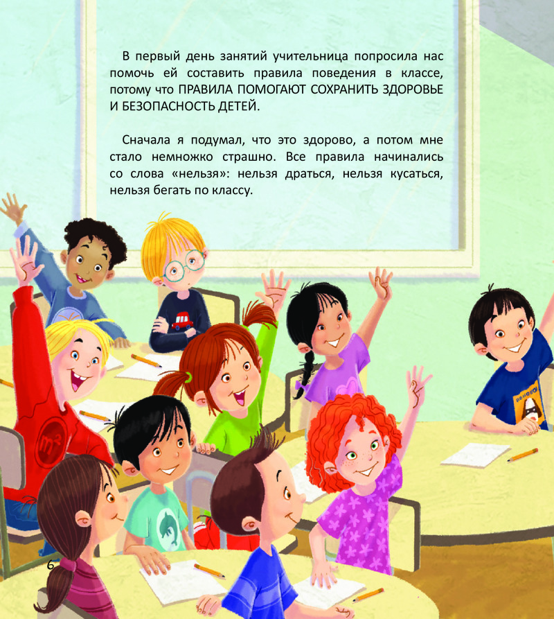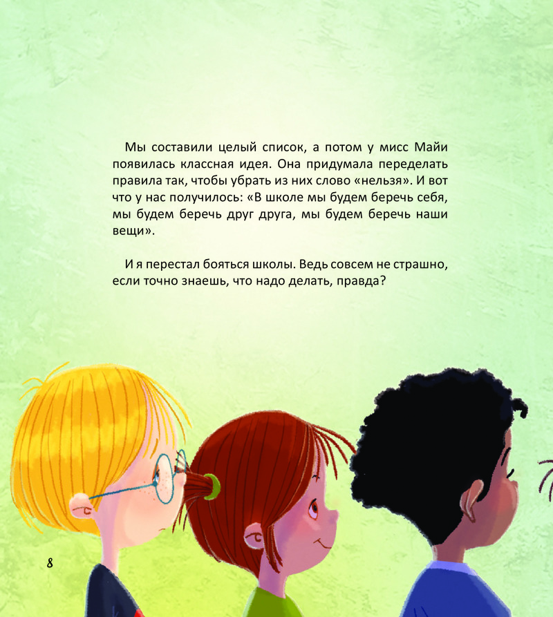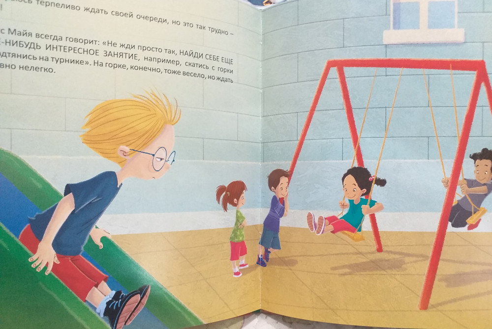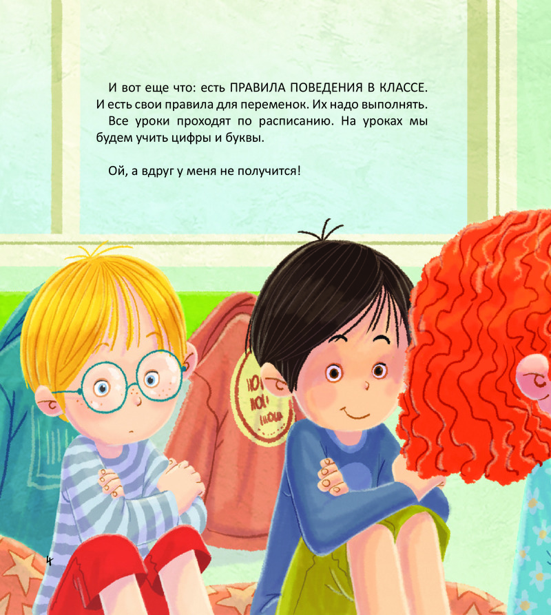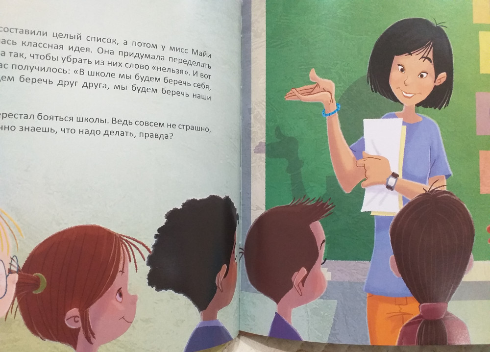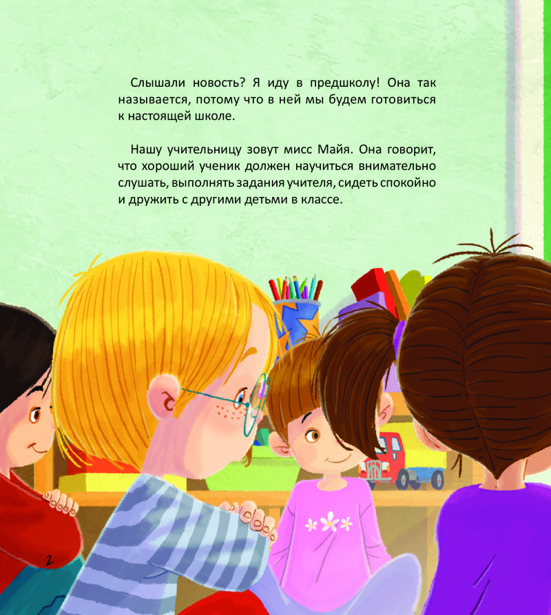 Книга квадратного формата, пришла плотно запаянная в пленку. Страницы очень плотные мелованные, шрифт хороший, крупный (некоторые важные слова и фразы по тексту выделены еще крупнее, но не аляписто). Рисунки мультяшные, яркие, крупные. Понравилось, что очень хорошо и узнаваемо изображены эмоции героев. На книге зачем-то супер, полностью дублирующий макет обложки - вот он, по моему мнению, лишний. Супер хорош на дорогих изданиях, защищая обложку, а тут обложка твердая лакированная - она очень устойчива к повреждениям. Книга для детей 5-6 лет, которым предстоит идти в подготовительную группу садика или в нулевой класс. В книге автор говорит о некоей предшколе - что это? Наверное, наш аналог вышеперечисленного, но автор-то иностранный) В книге нет информации о непосредственно учебных занятиях - книжный преподаватель Майя учит детей вести себя с учителем, внимательно слушать на уроках, быть собранным. Кроме этого, акцентируется внимание на взаимоотношениях с другими детьми в школе и на игровой площадке - детей учат комфортно учиться вместе. Понравилось, что, прописывая правила поведения в школе, Майя интересно формулирует - " В школе мы будем беречь себя, мы будем беречь друг друга, мы будем беречь наши вещи".