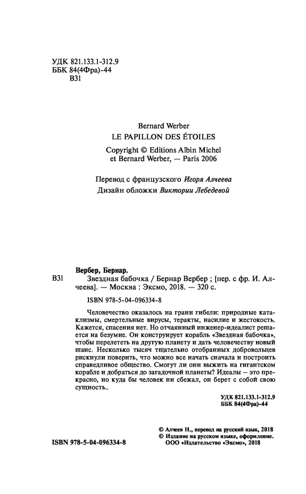 В данный момент этот товар отсутствует в продаже. Возможно, у нас найдется аналогичный или похожий товар здесь. Серия: Бесконечная вселенная Бернара Вербера (обложка) Человечество оказалось на грани гибели: природные катаклизмы, смертельные вирусы, теракты, насилие и жестокость. Кажется, спасения нет. Но отчаянный инженер-идеалист решается на безумие. Он конструирует корабль «Звездная бабочка», чтобы перелететь на другую планету и дать человечеству новый шанс. Несколько тысяч тщательно отобранных добровольцев рискнули поверить, что можно все начать сначала и построить справедливое общество. Смогут ли они выжить на гигантском корабле и добраться до загадочной планеты? Идеалы — это прекрасно, но, куда бы человек ни сбежал, он берет с собой свою сущность. |