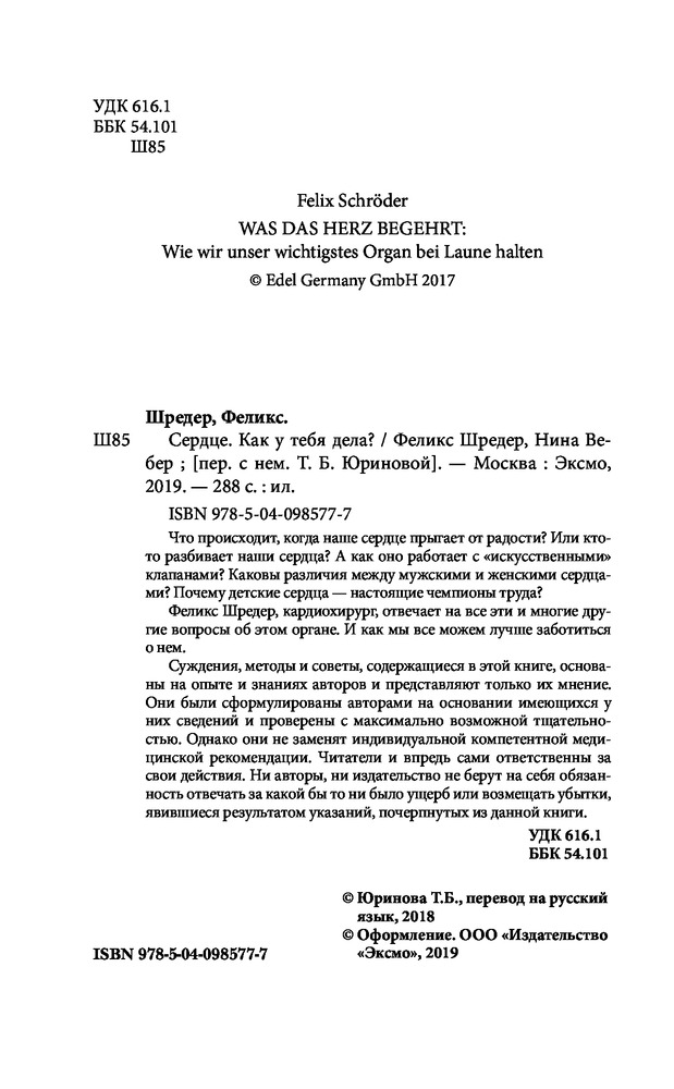 Сердце. Как у тебя дела?В данный момент этот товар отсутствует в продаже. Возможно, у нас найдется аналогичный или похожий товар здесь. Что происходит, когда наше сердце прыгает от радости? Или кто-то разбивает наши сердца? А как оно работает с «искусственными» клапанами? Каковы различия между мужскими и женскими сердцами? Почему детские сердца — настоящие чемпионы труда? Феликс Шредер, кардиохирург, отвечает на все эти и многие другие вопросы об этом органе. И как мы все можем лучше заботиться о нем. Суждения, методы и советы, содержащиеся в этой книге, основаны на опыте и знаниях авторов и представляют только их мнение. Они были сформулированы авторами на основании имеющихся у них сведений и проверены с максимально возможной тщательностью. Однако они не заменят индивидуальной компетентной медицинской рекомендации. Читатели и впредь сами ответственны за свои действия. Ни авторы, ни издательство не берут на себя обязанность отвечать за какой бы то ни было ущерб или возмещать убытки, явившиеся результатом указаний, почерпнутых из данной книги. |