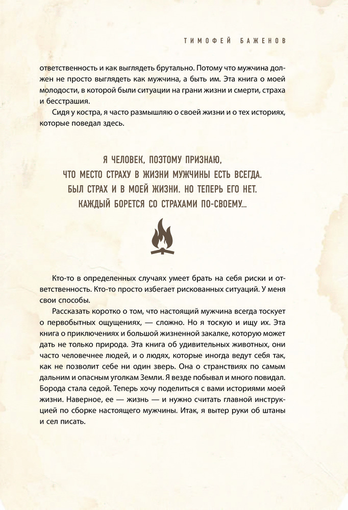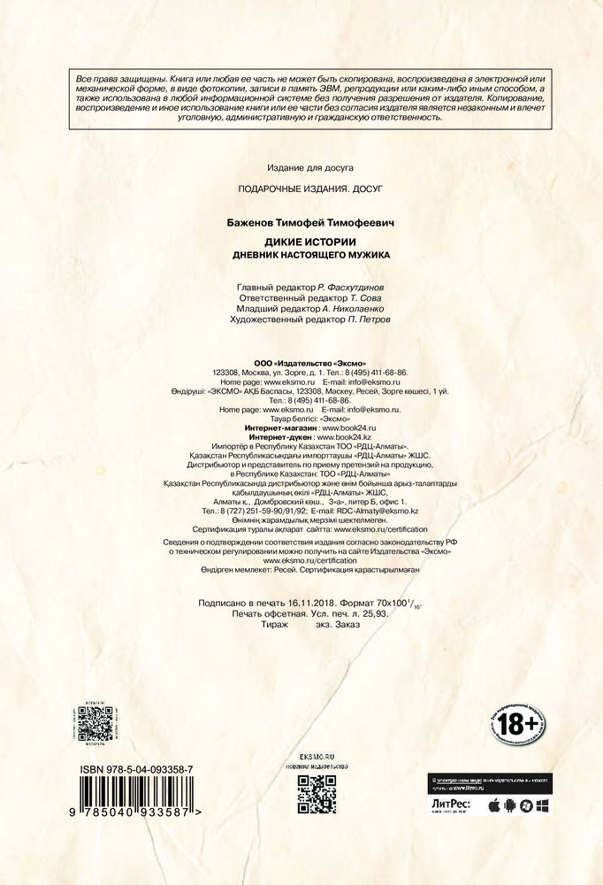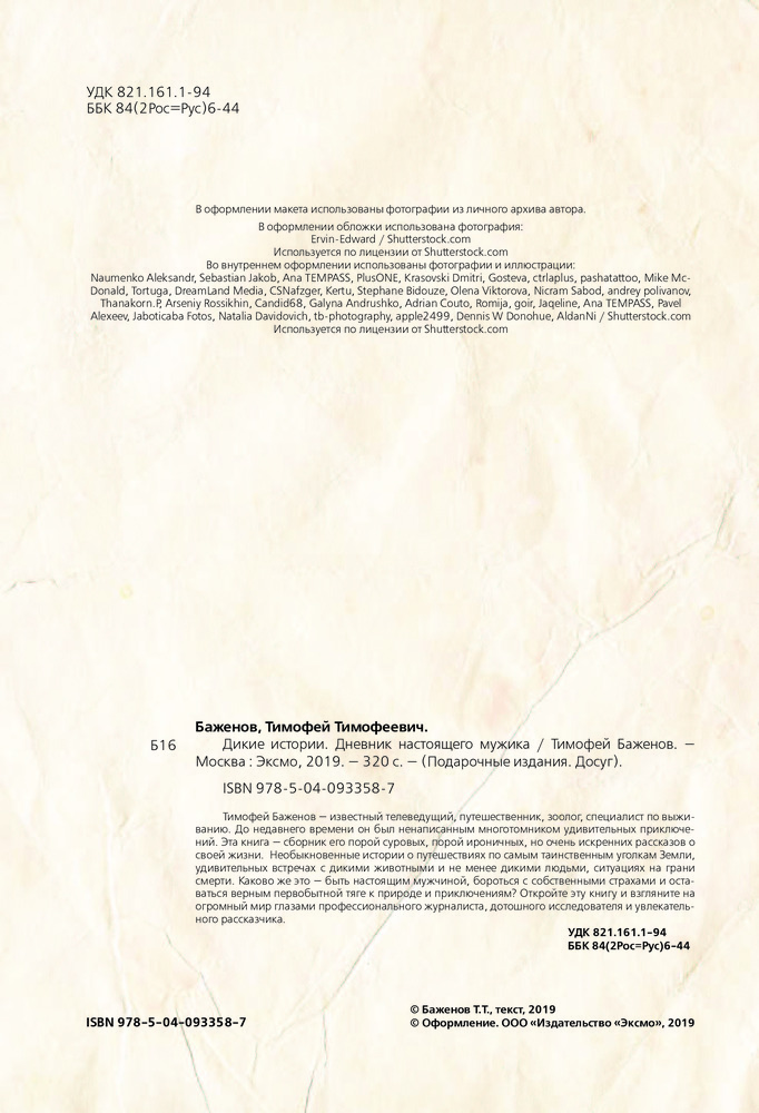 Дикие истории. Дневник настоящего мужикаВ данный момент этот товар отсутствует в продаже. Возможно, у нас найдется аналогичный или похожий товар здесь. Серия: Подарочные издания. Досуг Тимофей Баженов — известный телеведущий, путешественник, зоолог, специалист по выживанию. До недавнего времени он был ненаписанным многотомником удивительных приключений. Эта книга — сборник его искренних, порой суровых, порой ироничных историй о своей жизни, путешествиях по самым таинственным уголкам Земли, удивительных встречах с дикими животными и не менее дикими людьми. Каково же это — быть настоящим мужчиной, бороться с собственными страхами и оставаться верным первобытной тяге к природе и приключениям? Откройте эту книгу и взгляните на огромный мир глазами профессионального журналиста, дотошного исследователя и увлекательного рассказчика. |