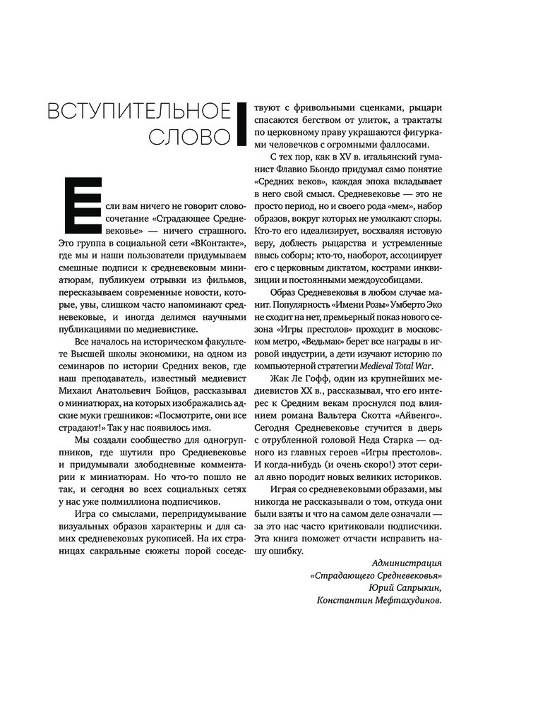Страдающее СредневековьеСергей Олегович Зотов, Дильшат Догановна Харман В данный момент этот товар отсутствует в продаже. Возможно, у нас найдется аналогичный или похожий товар здесь. Серия: История и наука Рунета. Подарочное издание Эта книга расскажет о том, как в христианской иконографии священное переплеталось с комичным, монструозным и непристойным. Многое из того, что сегодня кажется возмутительным святотатством, в Средневековье, эпоху почти всеобщей религиозности, было вполне в порядке вещей. Речь пойдёт об обезьянах на полях древних текстов, непристойных фигурах на стенах церквей и о святых в монструозном обличье. Откуда взялись эти образы, и как они связаны с последующим развитием мирового искусства? Первый на русском языке научно-популярный текст, охватывающий столько сюжетов средневековой иконографии, выходит по инициативе «Страдающего Средневековья» — сообщества любителей истории, объединившего почти полмиллиона подписчиков. Более 600 иллюстраций, уникальный текст и немного юмора — вот так и следует говорить об искусстве. |
