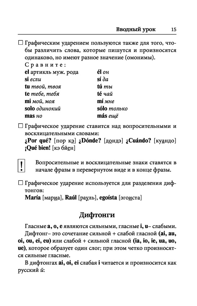 Самоучитель поможет в краткий срок овладеть лексическим и грамматическим минимумом начального уровня и простыми формами разговорной речи. Материал курса разбит на 10 уроков, в которых представлены основные темы грамматики и полезная лексика, необходимая в повседневном общении. Для отработки практических навыков предлагается большое количество упражнений с ответами. Все тексты и диалоги даются с параллельным переводом на русский язык, в конце книги также помещен испанско-русский словарь.