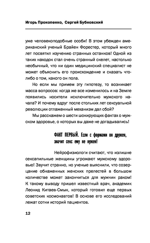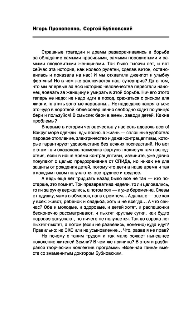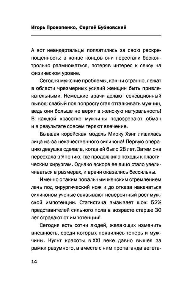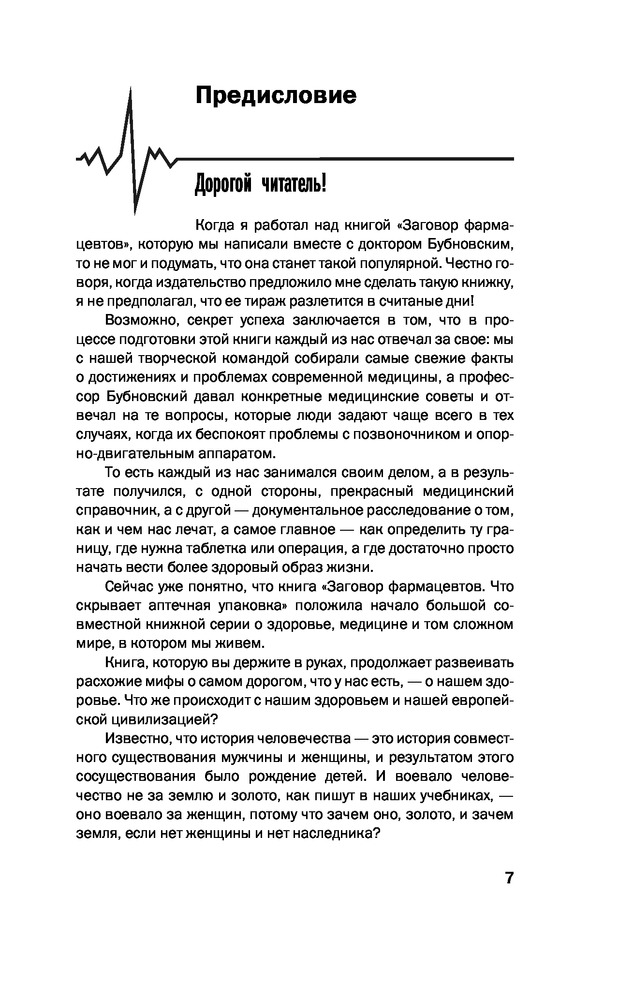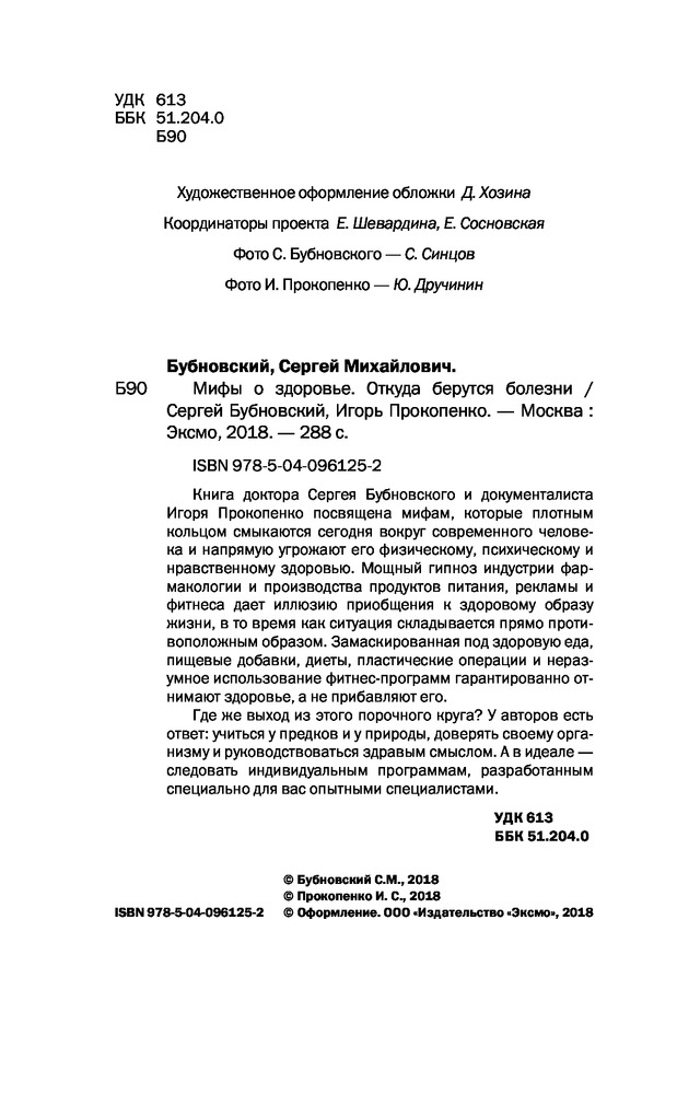 Книга доктора Сергея Бубновского и документалиста Игоря Прокопенко посвящена мифам, которые плотным кольцом смыкаются сегодня вокруг современного человека и напрямую угрожают его физическому, психическому и нравственному здоровью. Мощный гипноз индустрии фармакологии и производства продуктов питания, рекламы и фитнеса дает иллюзию приобщения к здоровому образу жизни, в то время как ситуация складывается прямо противоположным образом. Замаскированная под здоровую еда, пищевые добавки, диеты, пластические операции и неразумное использование фитнес-программ гарантированно отнимают здоровье, а не прибавляют его.