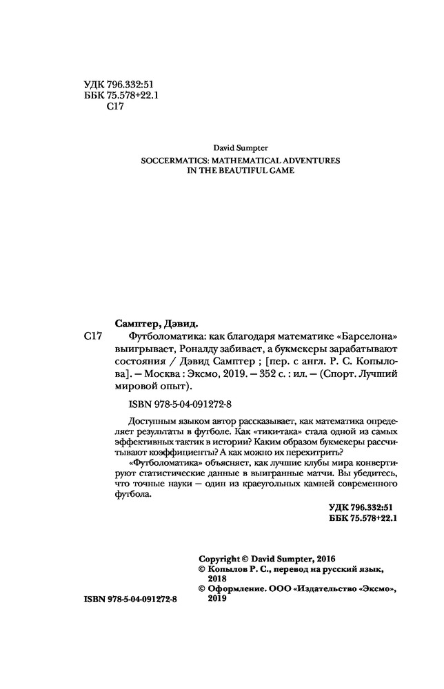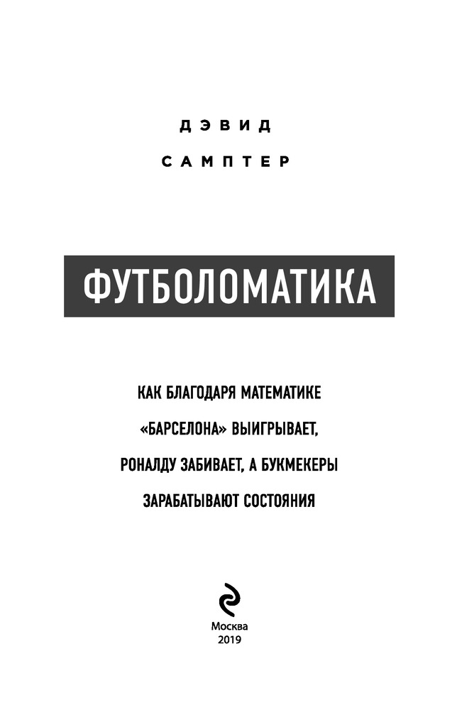 Футболоматика: как благодаря математике «Барселона» выигрывает, Роналду забивает, а букмекеры зарабатывают состоянияВ данный момент этот товар отсутствует в продаже. Возможно, у нас найдется аналогичный или похожий товар здесь. Серия: Спорт. Лучший мировой опыт Существует целый ряд футбольных вопросов, на которые можно ответить при помощи математики. Какова вероятность двух голов на последних минутах в финале Лиги чемпионов? Почему за победу в матчах чемпионата мы даем три очка? Кто лучше: Месси или Роналду? Что в действительности говорят об игре тепловые карты и статистика передач? |