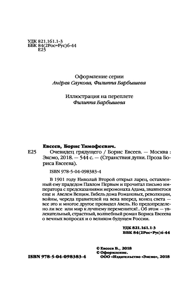 💳 Оплатить за товар можно при получении 🇰🇿 Есть бесплатная доставка по Казахстану 🎁 Копите бонусы с каждой покупки Серия: Странствия души. Проза Бориса Евсеева В 1901 году Николай Второй открыл ларец, оставленный ему прадедом — Павлом Первым и прочитал письмо императора с предсказаниями иеромонаха Адама, звавшегося еще и Авелем Вещим. Гибель дома Романовых, революции, войны, череда правителей на века вперед, конец света — все это и многое другое провидел Авель. Но предопределено ли все или мир к лучшему переменится? Об этом — увлекательный, страстный, волшебный роман Бориса Евсеева о вечных вопросах и о великом будущем России. |