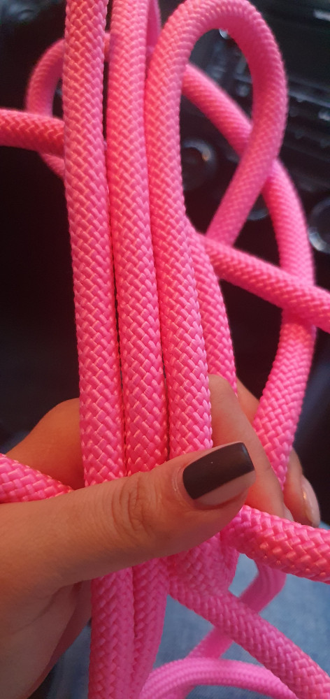 Скакалка для художественной гимнастики изготовлена из качественного синтетического материала полиамида, очень прочная, износостойкая. Сохраняет эластичность и форму.