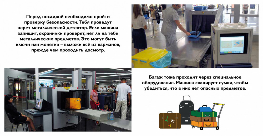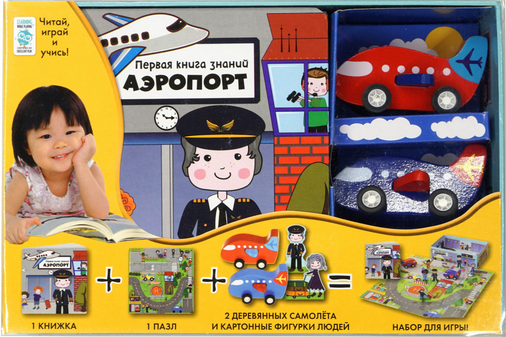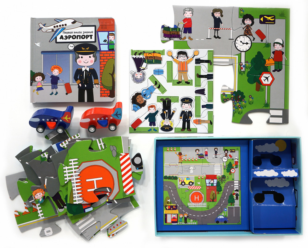 В набор входит: увлекательная книга на 64 страницах, которая расскажет об аэропортах и самолётах, 2 деревянных самолёта, 6 картонных фигурок людей, коробка, которая превращается в здание аэропорта, пазл из 16 элементов из плотного картона.