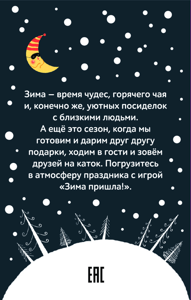 Зима пришла! Настольная игра для уютных посиделокВ данный момент этот товар отсутствует в продаже. Возможно, у нас найдется аналогичный или похожий товар здесь. Серия: Детские Легкая и очень красивая игра-активити на зимнюю тему для семей с детьми от 7 лет. |